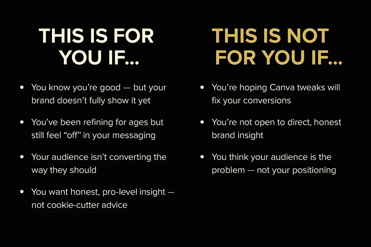 ⚡We’ll pull out what’s working, cut the fluff, and rebuild clarity around your most powerful positioning - the version of you that lands with people instantly.