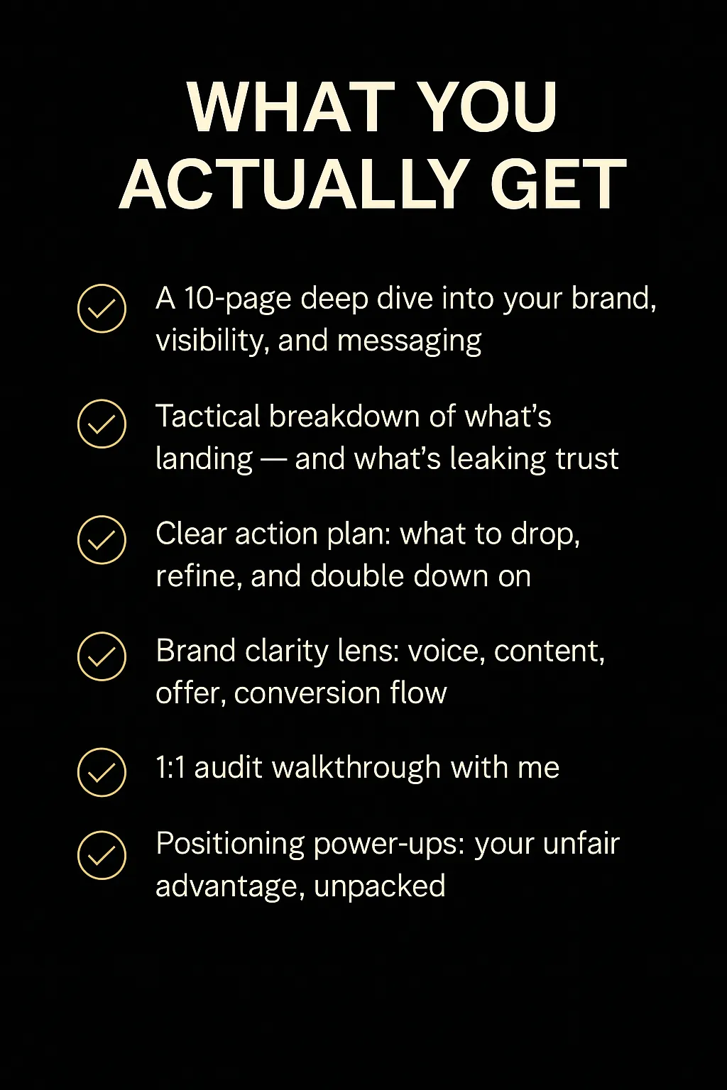 Hell no. This is a completely personalized audit. No AI. No templates. You’re getting my eyes, my brain, and my strategy tailored exactly to YOUR brand.