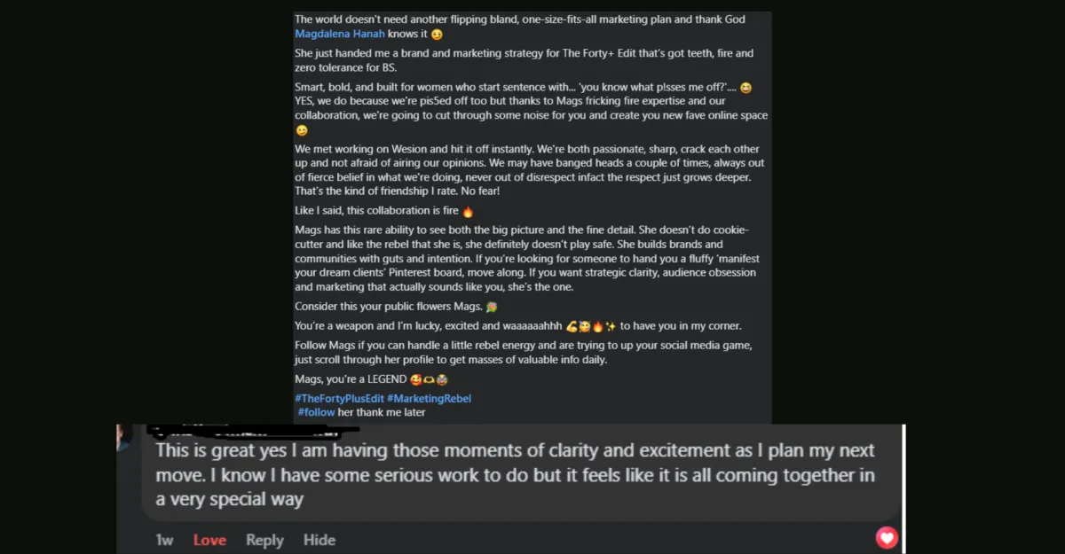 It’s sharp, it’s clear, and it’s deeply personalised. No templates. No nonsense. Just strategy, recommendations, and a bold roadmap that makes sense of the chaos and shows you where your power actually is.